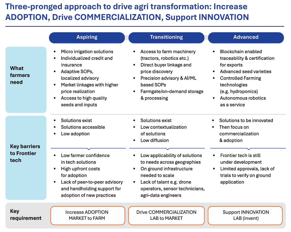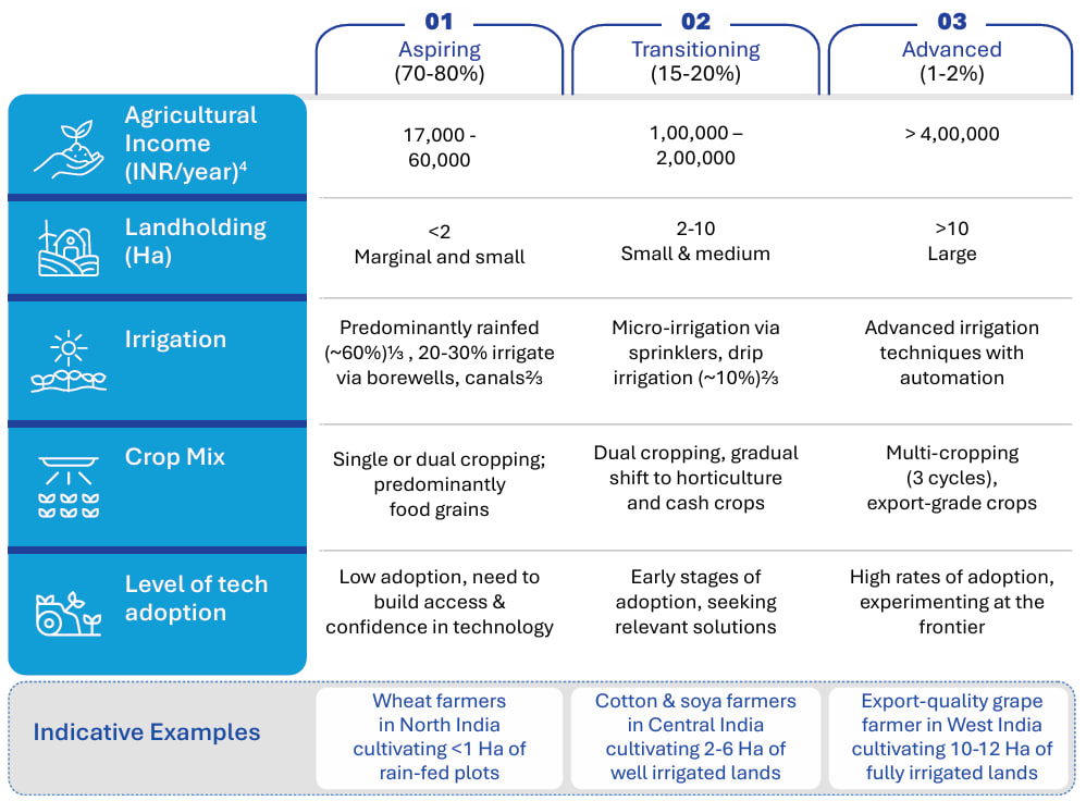 To ensure equitable transformation, the report categorizes farmers into three types: "Aspiring" (70-80%), "Transitioning" (15-20%), and "Advanced" (1-2%), suggesting customized strategies for each group.