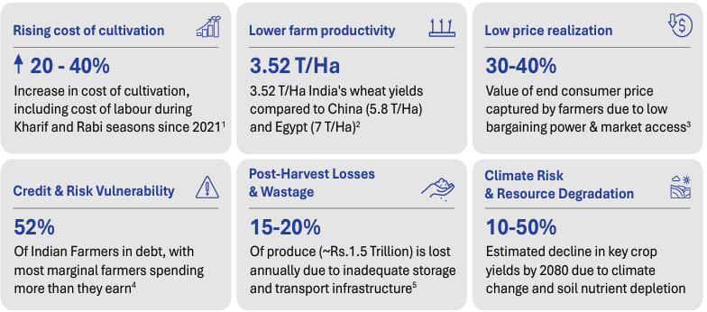 Indian agriculture, employing 45.8% of the workforce and producing 1 billion tonnes annually, struggles with fragmented land, low mechanization, post-harvest losses, and climate vulnerability.