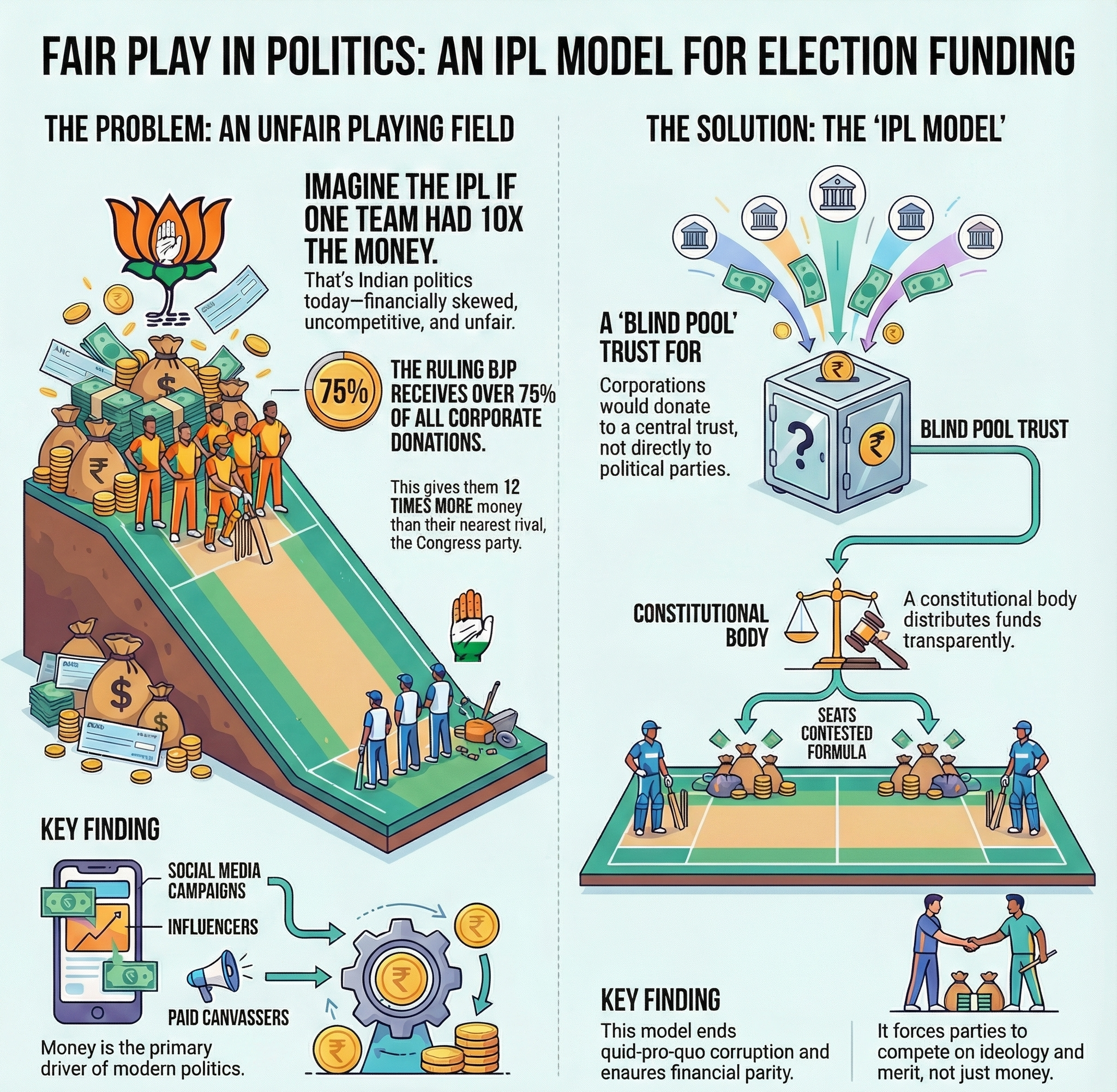 As suggested by former Chief Election Commissioner S.Y. Quraishi and endorsed by bodies like the Law Commission, a National Electoral Fund could be established where all donors contribute.