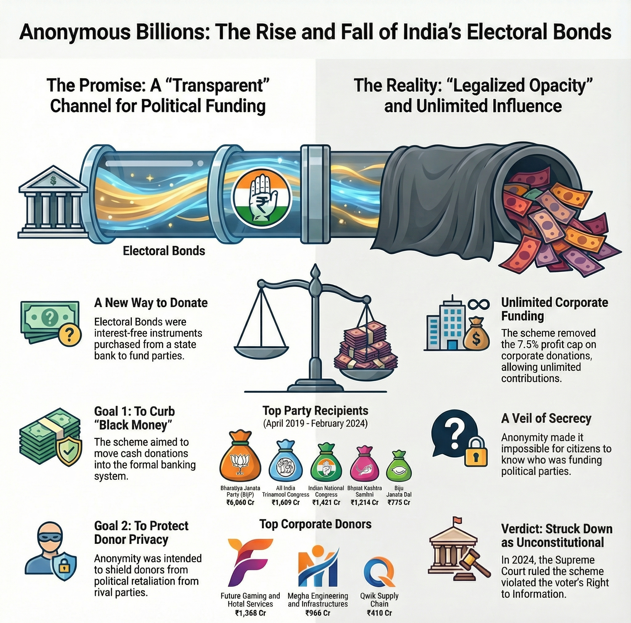 The Supreme Court declared the Electoral Bond scheme unconstitutional in February 2024, ruling that anonymous funding violates a citizen's right to information. The scheme has been struck down and no further bonds can be issued.