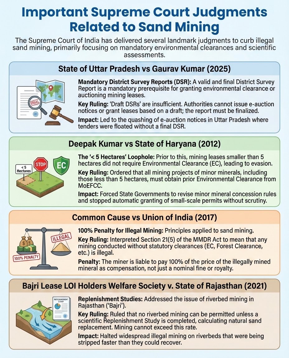 Finalization of District Survey Reports (DSRs): As per the Supreme Court judgement in State of UP vs Gaurav Kumar (2025), states must finalize District Survey Reports (DSRs) through scientific and public review before auctioning mining leases.