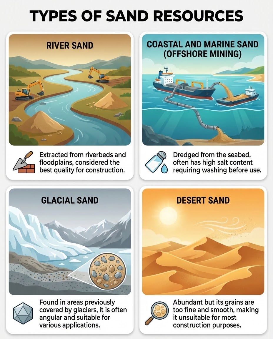The material is also vital for industrial applications, including glass manufacturing, electronics production, and coastal land reclamation.