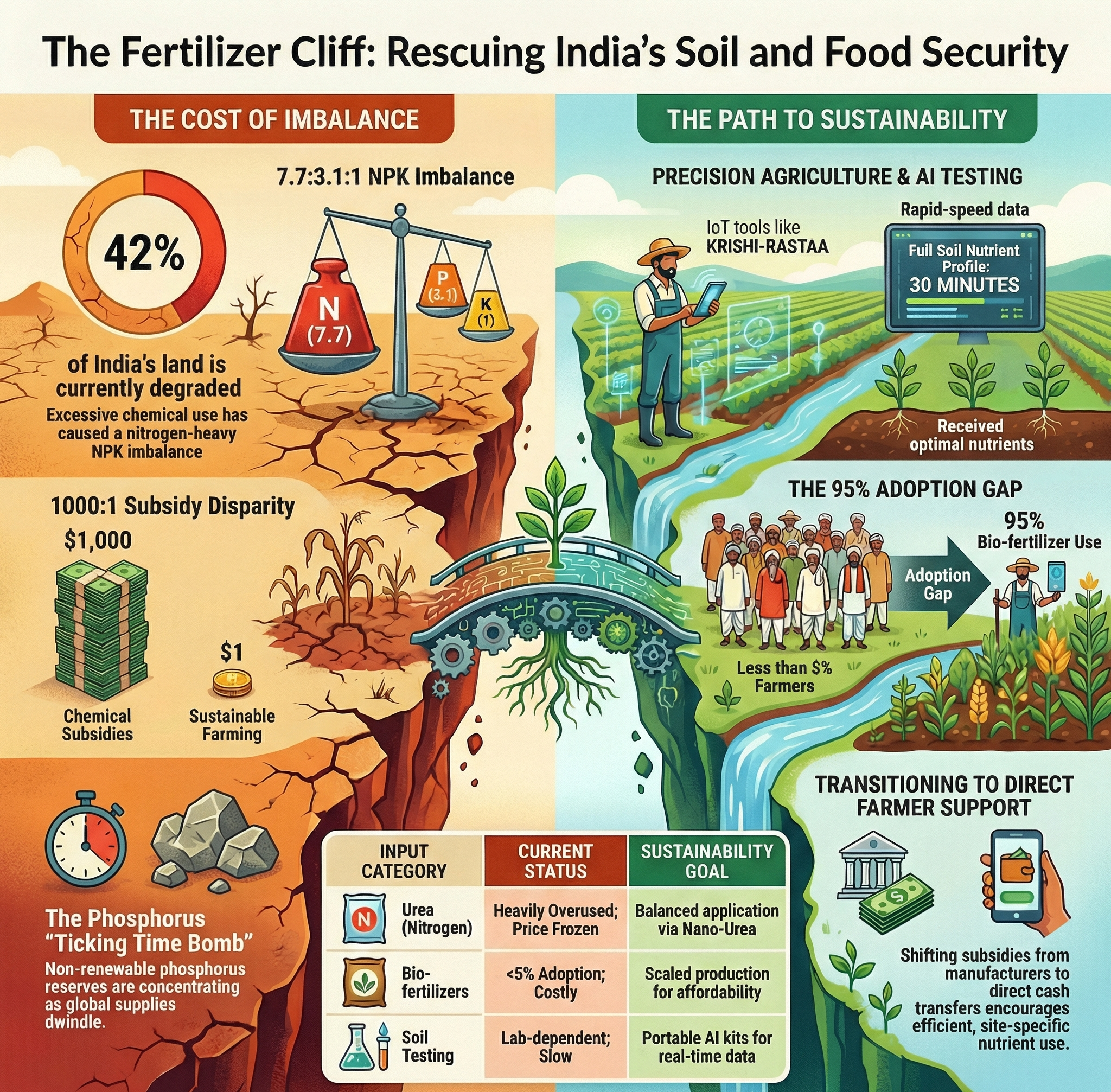 Reforming the Indian fertiliser sector for sustainable food security requires rationalizing subsidies, embracing innovations like nano-fertilisers, promoting balanced nutrient use through the Soil Health Card, and empowering farmers.