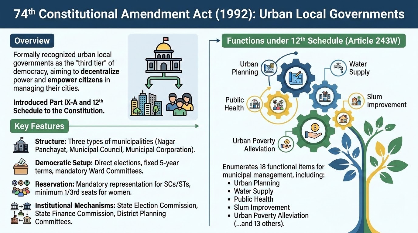 Constitutional Foundation (74th Amendment): Established the legal framework for city governance by mandating Urban Local Bodies (ULBs), State Election Commissions, and State Finance Commissions.