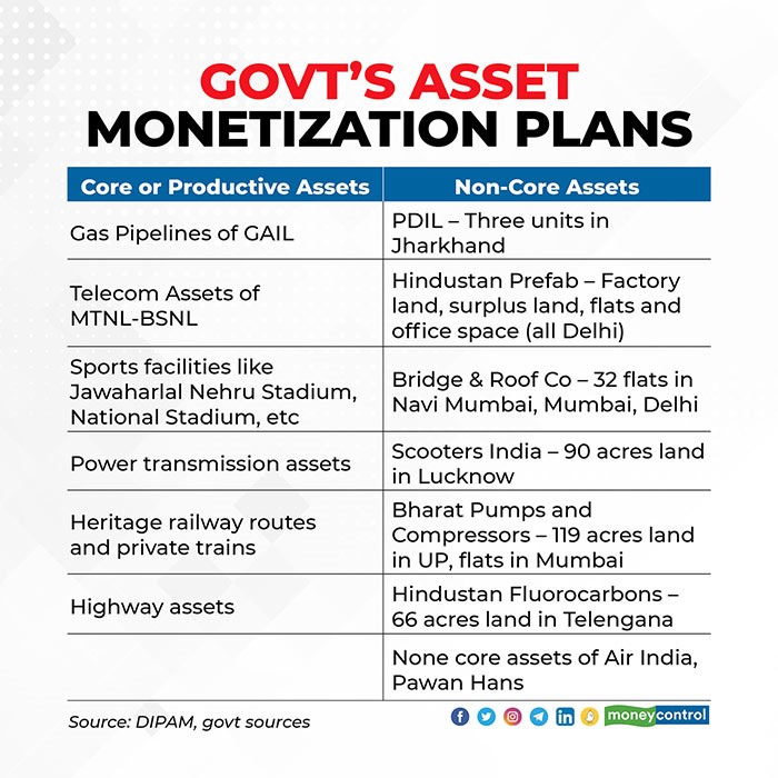 - Since 2018-19, plans to monetise the assets of the government and PSUs across the board, from key gas pipelines, power transmission lines and sports stadia to office spaces, land and apartments deemed surplus to requirements, have been taking shape.
