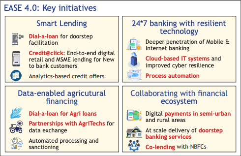 - PSB reforms agenda – EASE (Enhanced Access and Service Excellence) was launched based on the recommendations made by PSB Whole Time Directors (WTDs) and senior executives in PSB Manthan in November 2017.